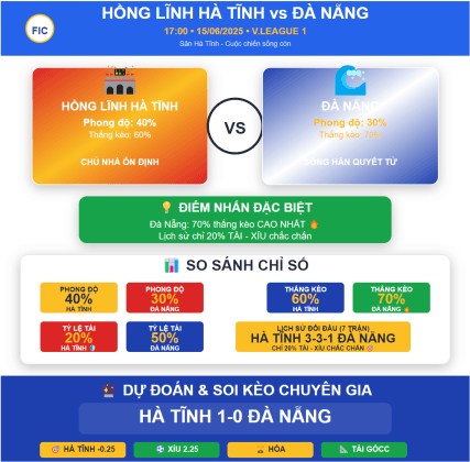Tổng kết: Cuộc đối đầu giữa sự ổn định và tuyệt vọng. Hà Tĩnh với lợi thế sân nhà và phong độ tốt hơn được đánh giá cao, nhưng Đà Nẵng với tinh thần quyết tử và tỷ lệ thắng kèo ấn tượng hoàn toàn có thể tạo bất ngờ. Khuyến nghị mạnh chọn Xỉu 2.25 bàn dựa trên xu hướng rõ ràng của cả hai đội.
