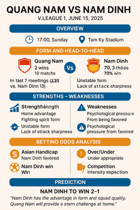 Kết luận: Nhận định Quảng Nam vs Nam Định cho thấy đây sẽ là trận đấu thú vị với nhiều yếu tố cân bằng. Nam Định được đánh giá cao hơn nhưng Quảng Nam với lợi thế sân nhà hoàn toàn có thể tạo bất ngờ.