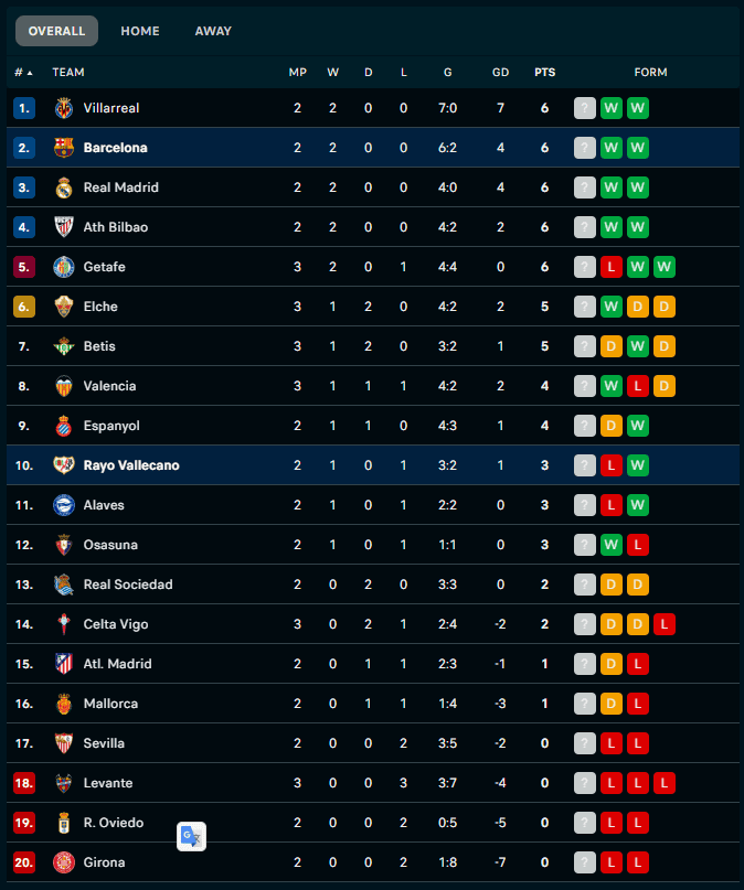 Bảng xếp hạng Rayo Vallecano vs Barcelona
