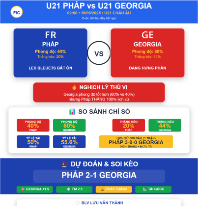 Kết luận: Dù U21 Pháp được dự đoán sẽ giành chiến thắng, nhưng khả năng thắng đậm không cao trước một Georgia đầy quyết tâm. Trận đấu hứa hẹn căng thẳng và kịch tính đến phút cuối.